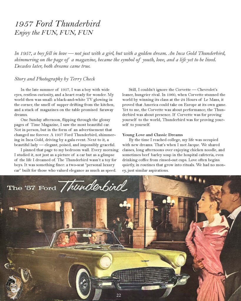 Looking back, I realize that what captured me in 1957 wasn’t just a car or a model in an ad. It was the promise of a life built around beauty, passion, and love. I didn’t just want to drive the Thunderbird — I wanted to live in the world it represented.