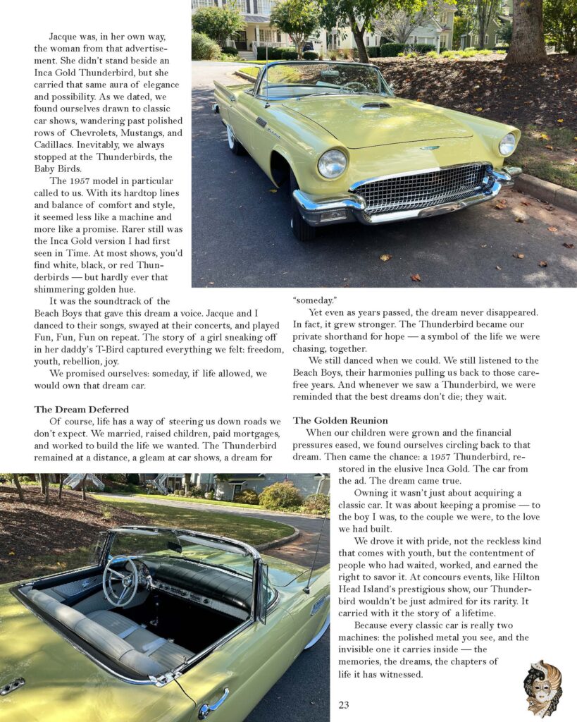 When our children were grown and the financial pressures eased, we found ourselves circling back to that dream. Then came the chance: a 1957 Thunderbird, restored in the elusive Inca Gold. The car from the ad. The dream came true.