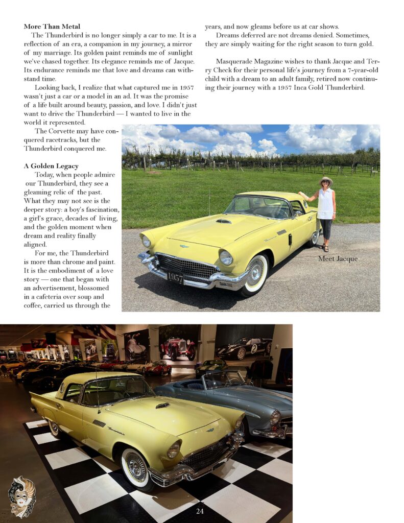 Dreams deferred are not dreams denied. Sometimes, they are simply waiting for the right season to turn gold. Masquerade Magazine wishes to thank Jacque and Terry Check for their personal journey from a 7-year-old child with a dream to an adult family, retired now continuing their journey with a 1957 Inca Gold Thunderbird.