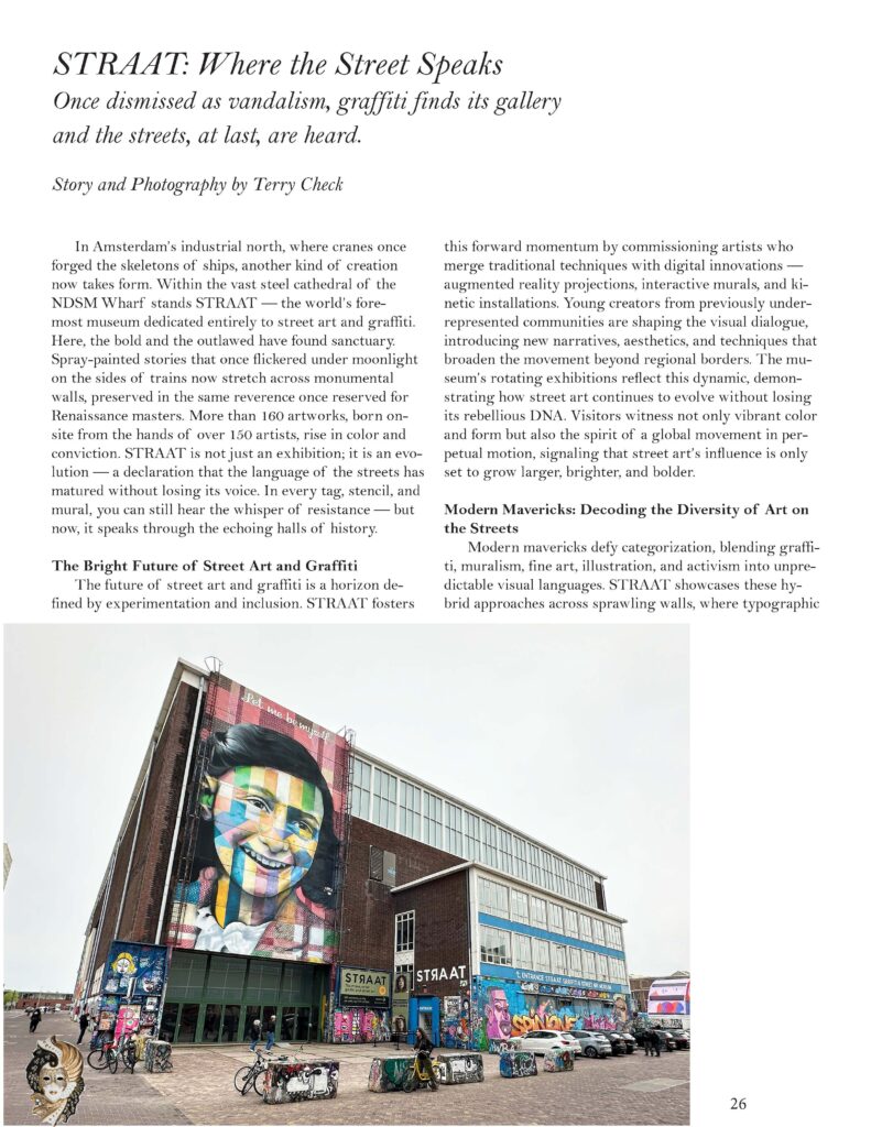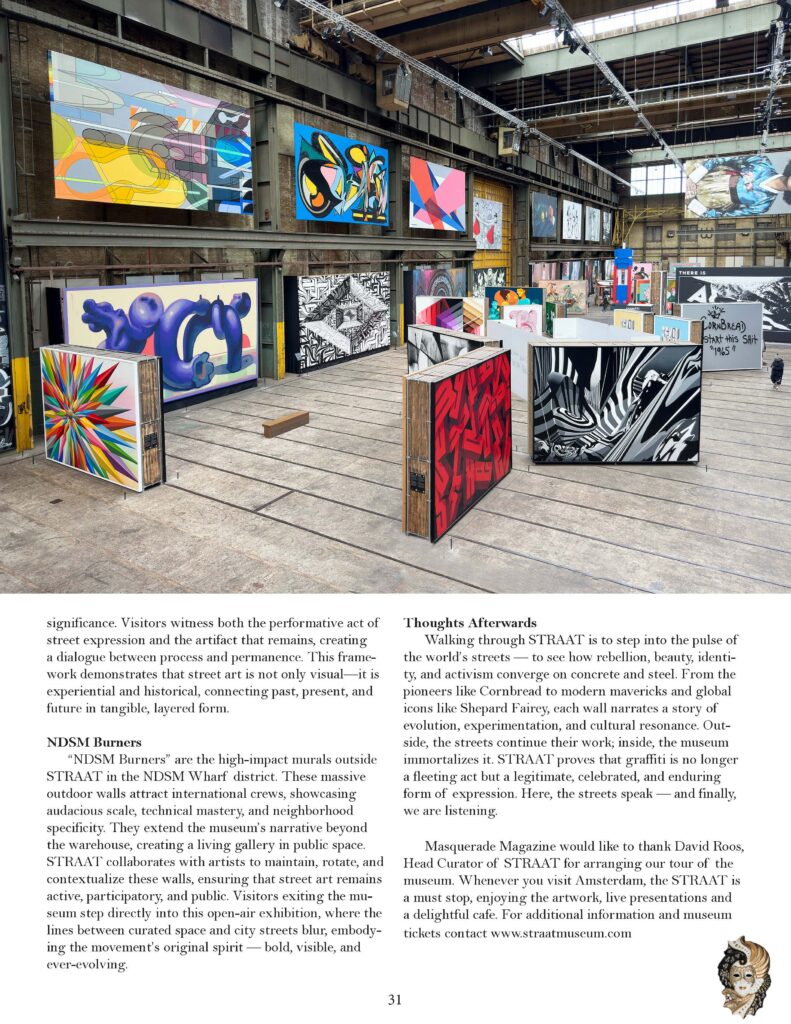 Masquerade Magazine would like to thank David Roos, Head Curator of STRAAT for arranging our tour of the museum. Whenever you visit Amsterdam, the STRAAT is a must stop, enjoying the artwork, live presentations and a delightful cafe. For additional information and museum tickets contact www.straatmuseum.com
