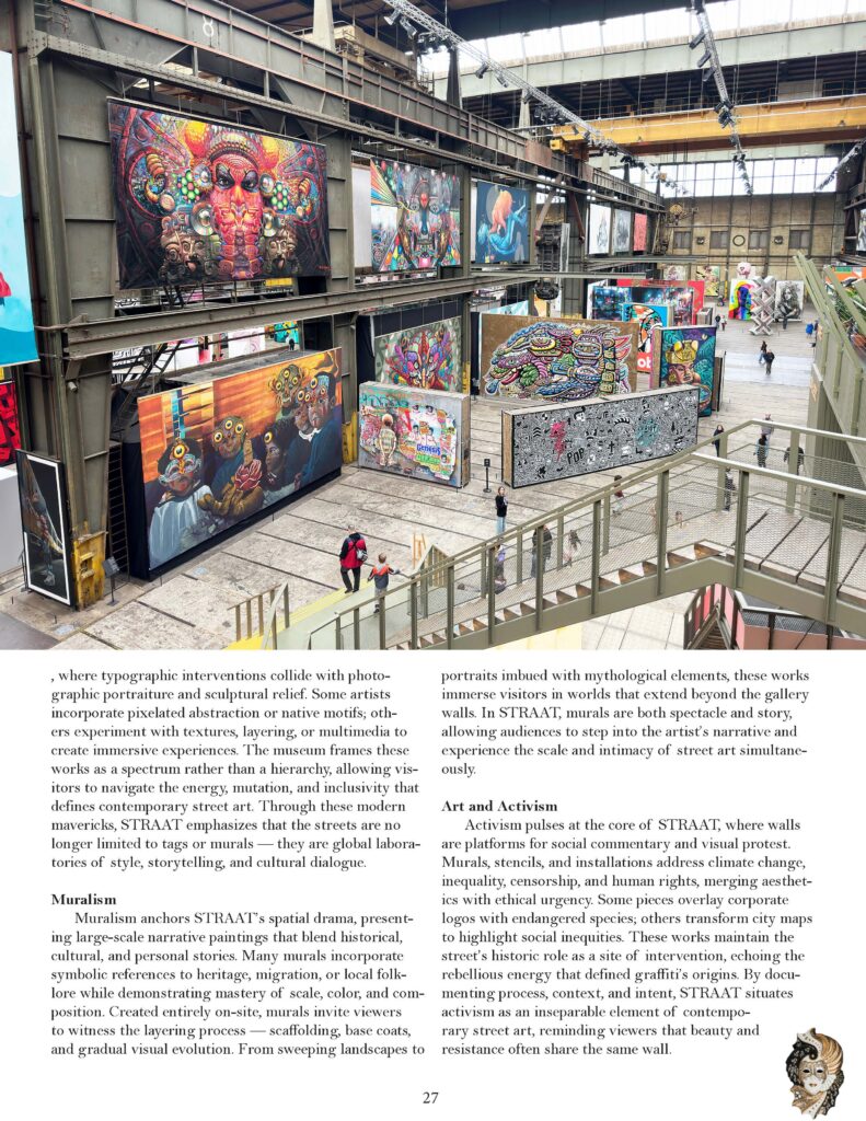 Muralism anchors STRAAT’s spatial drama, presenting large-scale narrative paintings that blend historical, cultural, and personal stories. Many murals incorporate symbolic references to heritage, migration, or local folklore while demonstrating mastery of scale, color, and composition. Created entirely on-site, murals invite viewers to witness the layering process — scaffolding, base coats, and gradual visual evolution. From sweeping landscapes to portraits imbued with mythological elements, these works immerse visitors in worlds that extend beyond the gallery walls. In STRAAT, murals are both spectacle and story, allowing audiences to step into the artist’s narrative and experience the scale and intimacy of street art simultaneously.