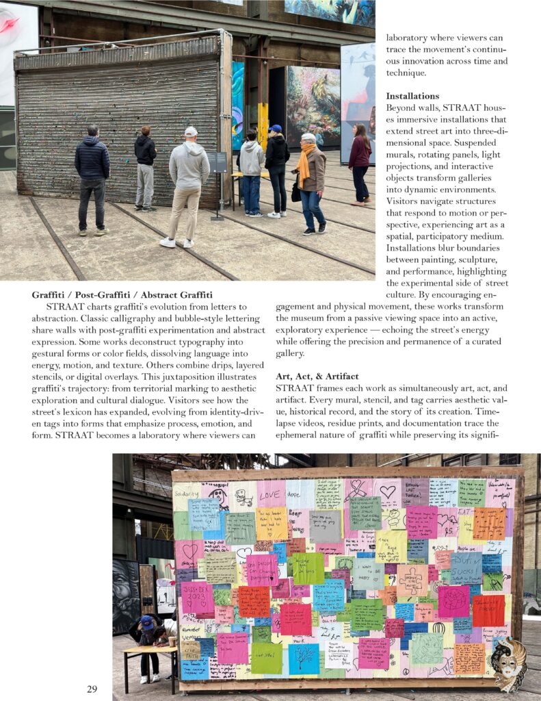 STRAAT frames each work as simultaneously art, act, and artifact. Every mural, stencil, and tag carries aesthetic value, historical record, and the story of its creation. Time-lapse videos, residue prints, and documentation trace the ephemeral nature of graffiti while preserving its significance. Visitors witness both the performative act of street expression and the artifact that remains, creating a dialogue between process and permanence. This framework demonstrates that street art is not only visual—it is experiential and historical, connecting past, present, and future in tangible, layered form.